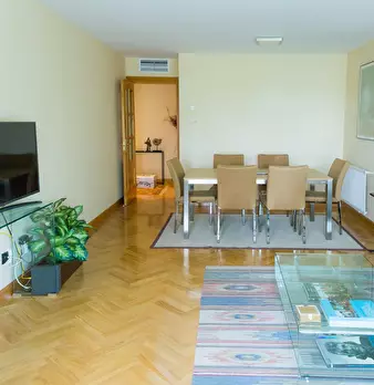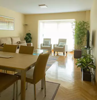 This stylishly decorated 100 sq. meter apartment has everything you need to make you feel at home. The real parquet flooring and big windows throughout radiate an appealing warmth. The main bedroom overlooks a nice park, has a queen-size bed (150...