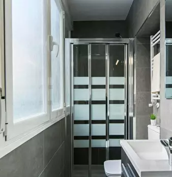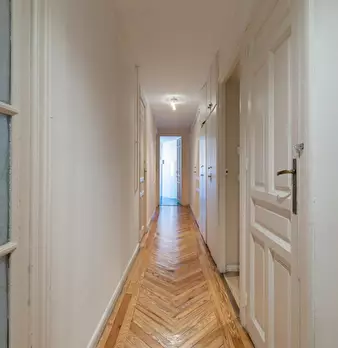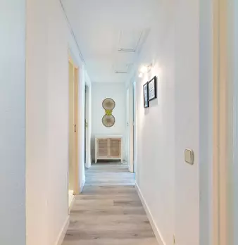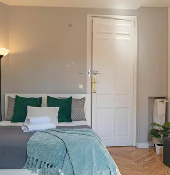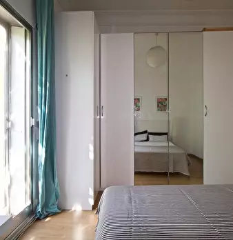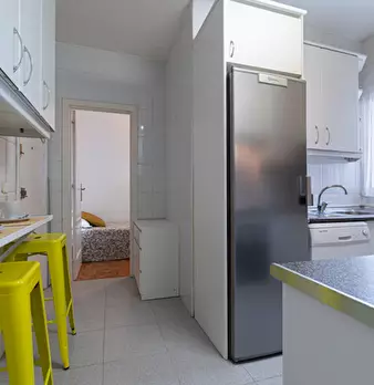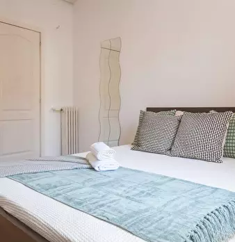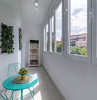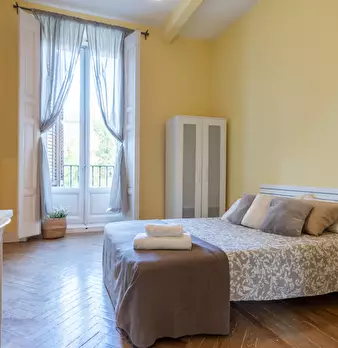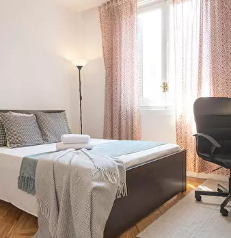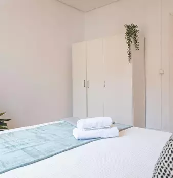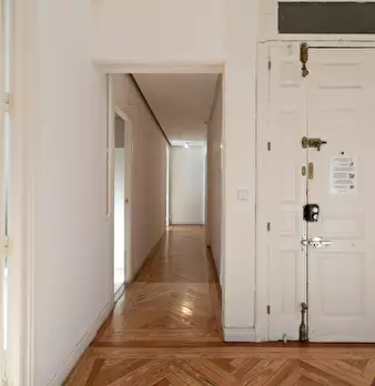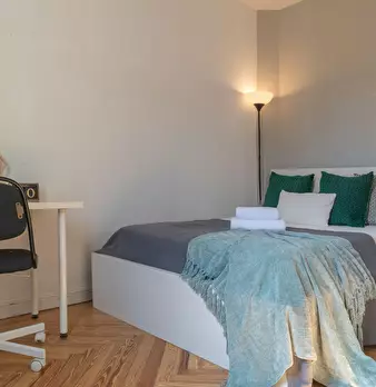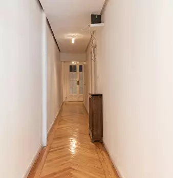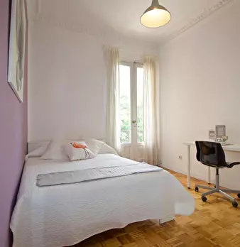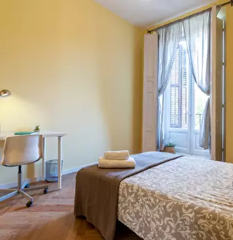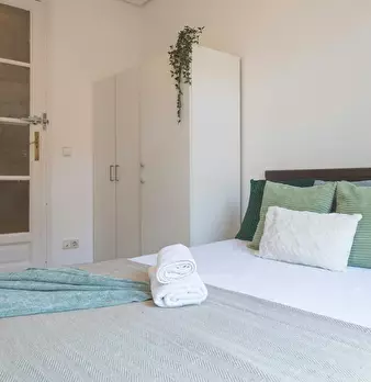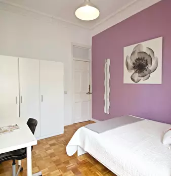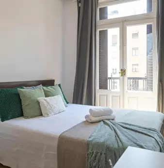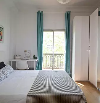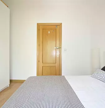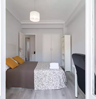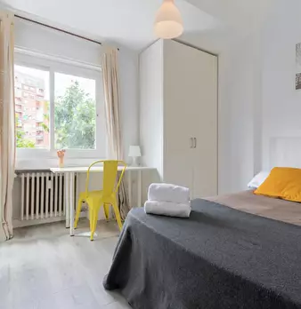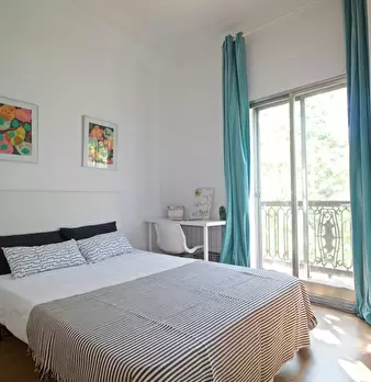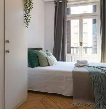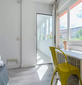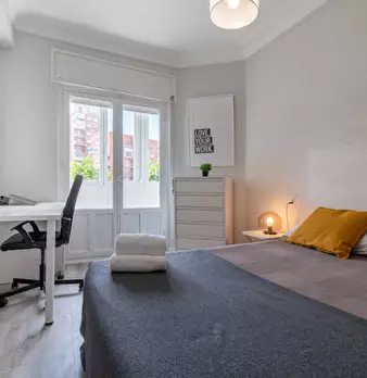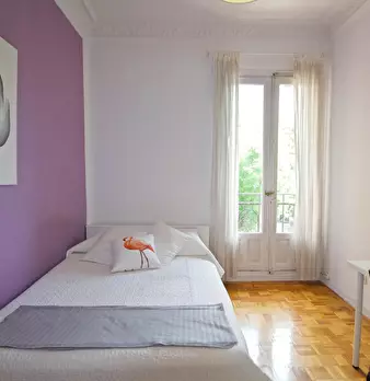 Large double exterior room with double bed, wardrobe, desk, study chair and terrace. The room does not include sheets or pillows, only the cover for the mattress. Spectacular renovated property on Calle Agustín de Foxá, perfectly connected to the...