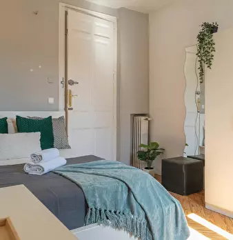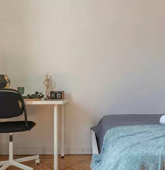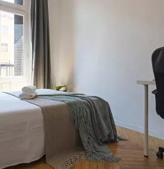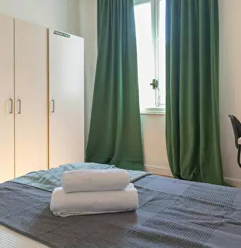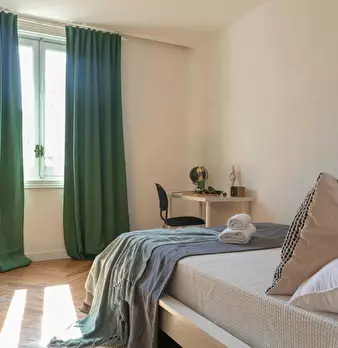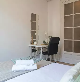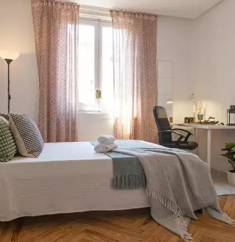 Private room equipped with desk and chair, bedside table, mirror, lamp, and closet. The bed does not include sheets and pillows, only the mattress cover. SERVICES AND RELEVANT INFORMATION: ✔Cleaning of common areas once a week. ✔Possibility of m...