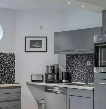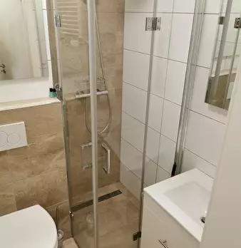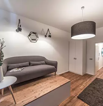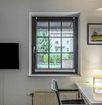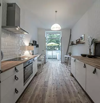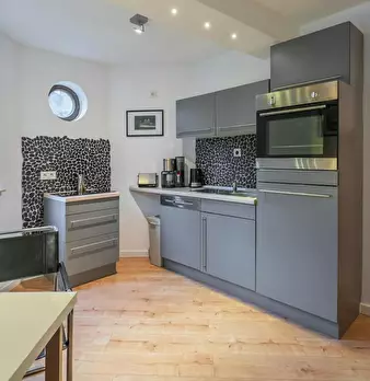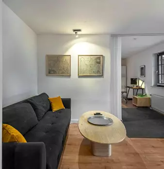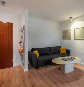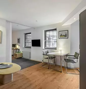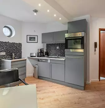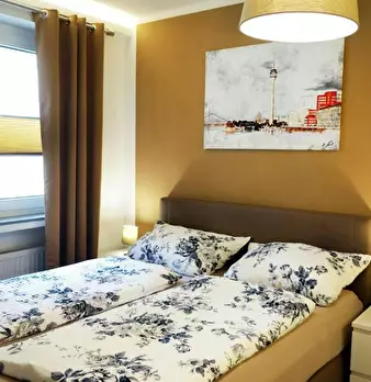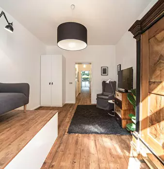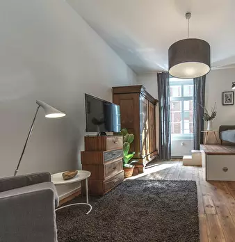 Deluxe Double Studio for rent in Dusseldorf! The unit comes with parquet floors and features a comfortable queen bed, a spacious wardrobe, a fully equipped kitchen, a dining area, a flat-screen TV with streaming service, and a private bathroom wit...