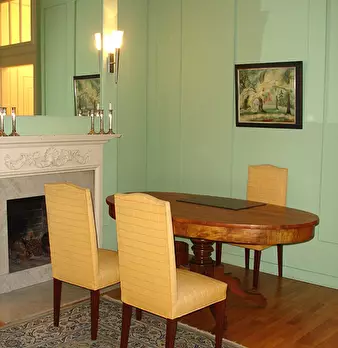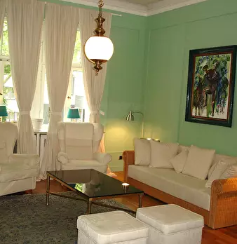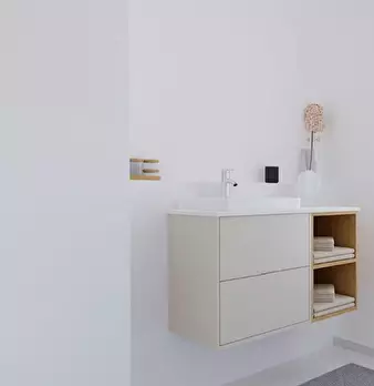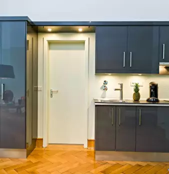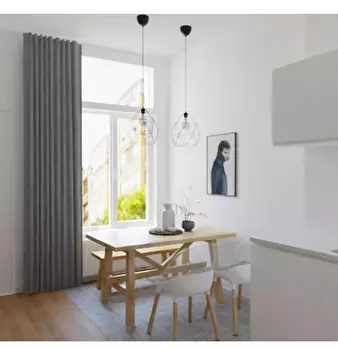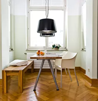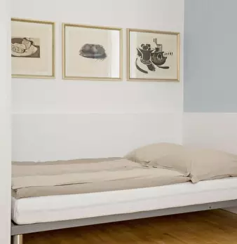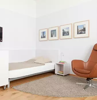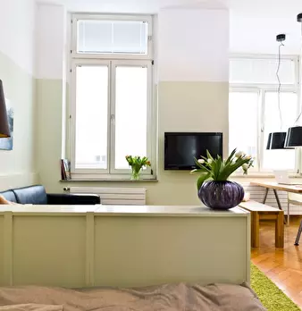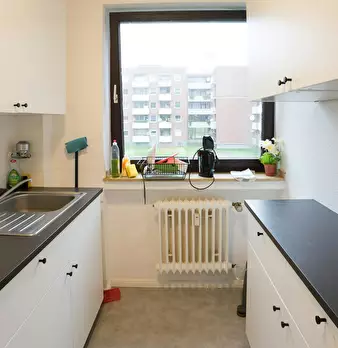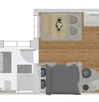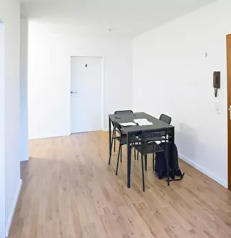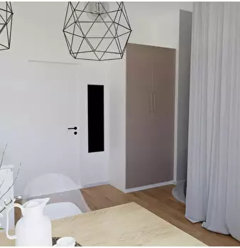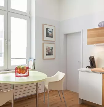 The apartment was redesigned and divided into clear areas. A visual separation of the bed puts it in the background and a feel-good atmosphere was also created. The focal point of the room is the dining table, which functions as the main place to ...