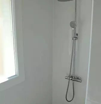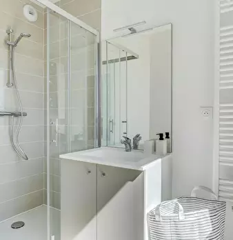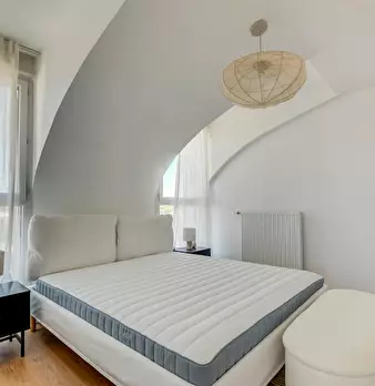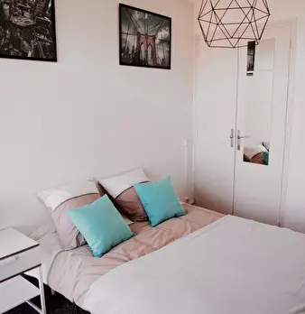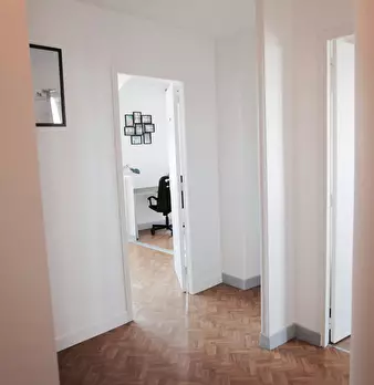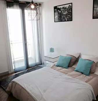 Chambre de 13m2, entièrement meublée. Elle dispose d’un lit double (140x190) accompagné d'une table de chevet avec lampe. Un espace de travail est disponible, composé d'un bureau avec chaise et lampe. La chambre propose également plusieurs rangeme...