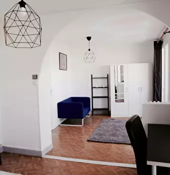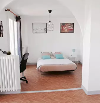 Très grande chambre de 20m2, entièrement meublée. Elle dispose d’un lit double (140x190) accompagné d'une table de chevet avec lampe. Un espace de travail est disponible, composé d'un bureau avec chaise et lampe. La chambre propose également plusi...