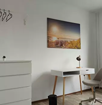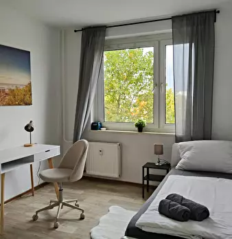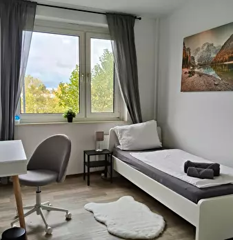 Schöne 3 Bett-Wohnung mit bequemen Bett, Schreibtisch, Gemeinschaftsküche und Essbereich mit TV Lage und Anbindung: Die Kombination aus ruhigem Wohnen, exzellenter Infrastruktur, perfekter Verkehrsanbindung und unmittelbarer Nähe zu wichtigen I...