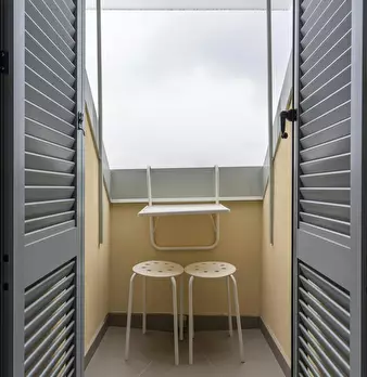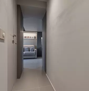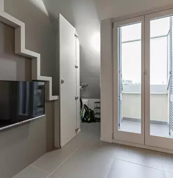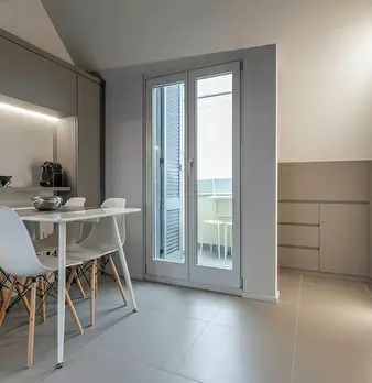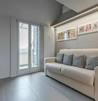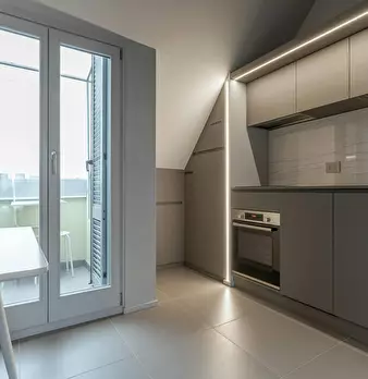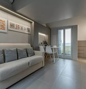 ---ENG--- The studio opens onto a modern living room dyed in sober shades of gray in which distinguish dining area and living area. The first consists of an open kitchen with oven and dishwasher, well lit by neon lights placed on the cabinets, an...