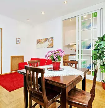 Recently renovated, this modern apartment of 76 sqm is furnished with taste and attention to detail. The entrance hall leads to the spacious living room with kitchen comprising a sitting area with sofa' and a dining area with an extendable table ...