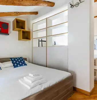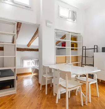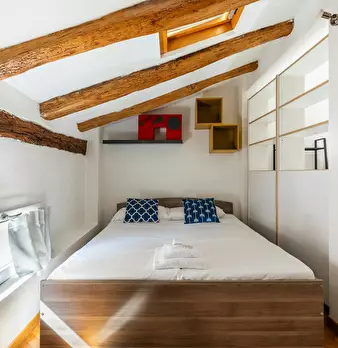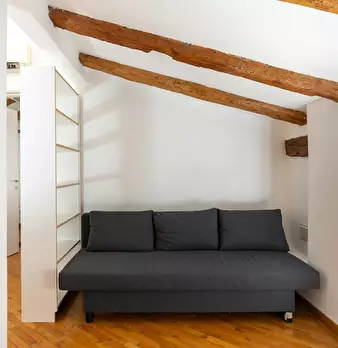 Nice studio of about 43 sqm, located on the first floor without an elevator, featuring: a living area with a kitchen and a sofa bed, a sleeping area with two single beds, and a bathroom with a walk-in shower. Overlooking a historic street in the h...