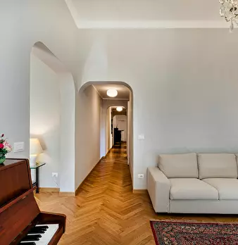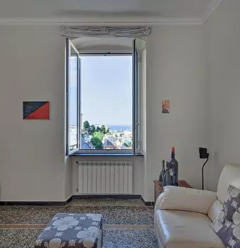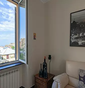 Lovely apartment in the quiet area of Castelletto overlooking Genoa and the sea. The apartment, located on the fourth floor of a building with an elevator, opens onto the bright living area, furnished with a sofa, a cabinet with TV, a dining tab...