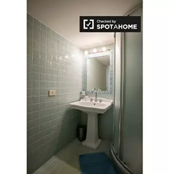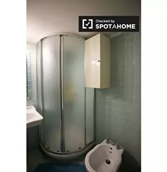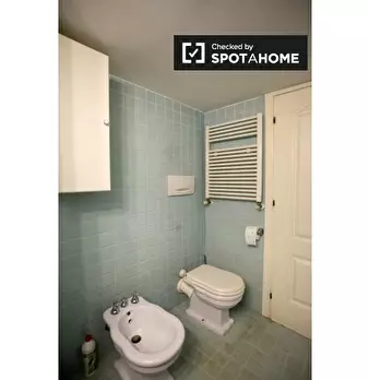 Questo appartamento di 40 m² con 1 camera da letto è disponibile in affitto a Garbatella, a Roma. Il piano inferiore è composto da soggiorno, cucina e bagno. Il soggiorno ha un divano, un televisore a parete a schermo piatto e un piccolo tavolo da...