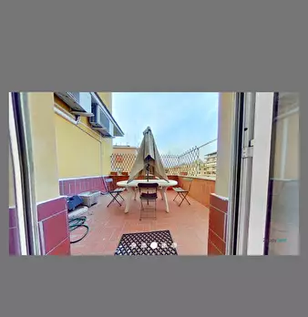 Attico luminoso e spazioso a Scalo San Lorenzo. In edificio di 7 piani, al settimo ed ultimo piano con ascensore. L'ingresso da direttamente sull'area living, con divano per 3, tavolo da pranzo per 2, poltroncina e tv. Il corridoio, con lavatrice...