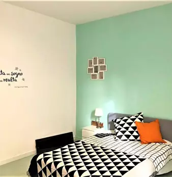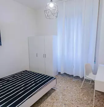 The room is large and really bright having a very big windows. It is a double room used as private. The flat is composed by 5 single rooms with two bathrooms one for female on for male The apartment has a washing machine, wi-fi, dishwasher and a f...