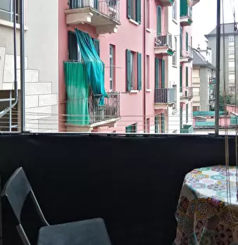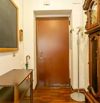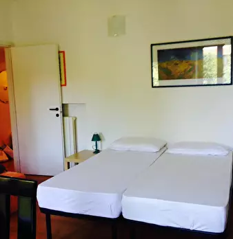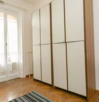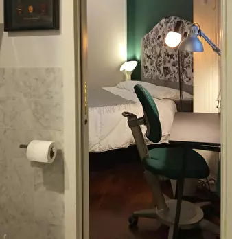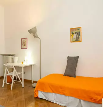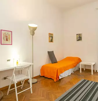 Large room (20m2) featuring 2 single beds(that can be arranged into a double bed), a table, 2 bookshelves and a wardrobe. The flat is composed by two other rooms. There is a kitchen with a table and all you need for cooking with a small balcony. ...