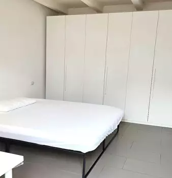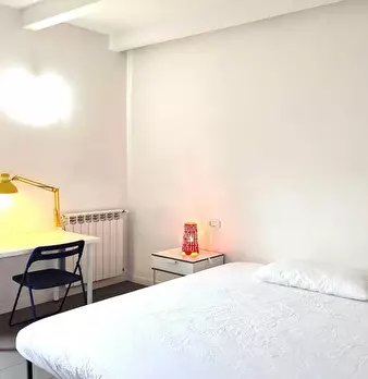 Ampia stanza singola completa di letto matrimoniale, comodini, scrivania, sedia, smart tv, armadio, libreria, cassettiera, aria condizionata caldo/freddo. Bagno privato con doccia en suite. All'arrivo vengono fornite una coppia di lenzuola, piumin...