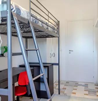 Classic single bedroom with office station, single bed, relaxation area with colored pouf. The room, furnished in a modern style, has an elegant wardrobe, a study station with desk and office chair, carpet, comfortable shoe rack / shelf and book...