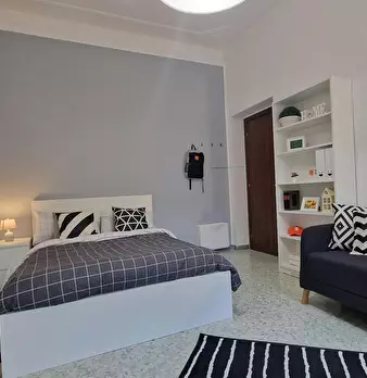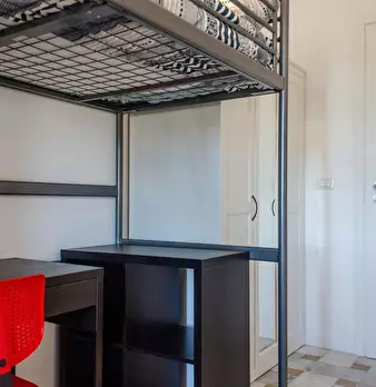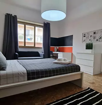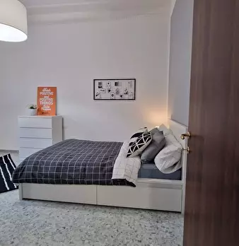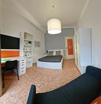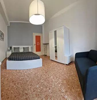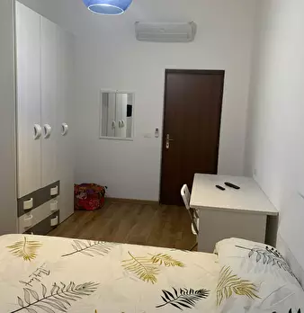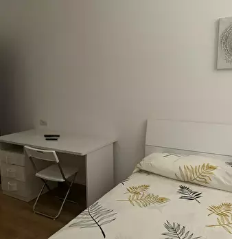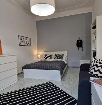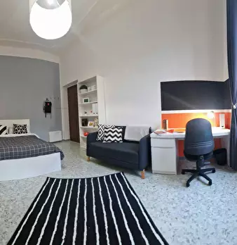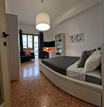 Ampia stanza singola completa di letto matrimoniale, comodini, scrivania, sedia, smart tv, armadio, libreria, specchio, cassettiera, aria condizionata caldo/freddo. Bagno esterno in condivisione con un solo inquilino composto da wc, lavello e due ...