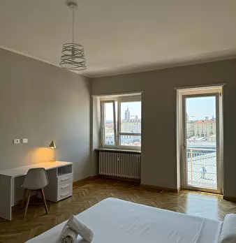 Renovated apartment located at 5 min walk to Piazza Castello, complete with beds, desk, chairs, lights and wardrobe. Shared kitchen equipped with pots, plates, glasses, cutlery, oven, induction hob. Bathroom with shared shower and washing machine....