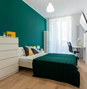 Questa seconda camera, altrettanto ampia e ben illuminata, è perfetta per studenti o lavoratori. È arredata con un letto, una scrivania con sedia e un armadio spazioso, offrendo un ambiente tranquillo e ideale per lo studio e il riposo. Anche se ...