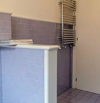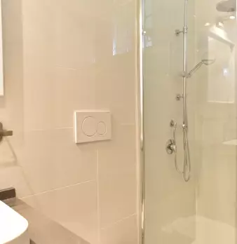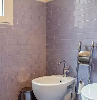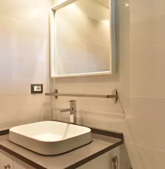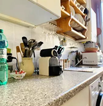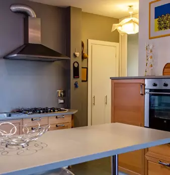 Questo appartamento dispone di un soggiorno aperto con divano e un lungo tavolo da pranzo. La cucina è completamente attrezzata e ha un forno e fornelli. Ci sono degli armadi sopra il lavandino e lungo il muro dietro l'angolo. Ci sono tre bagni, m...