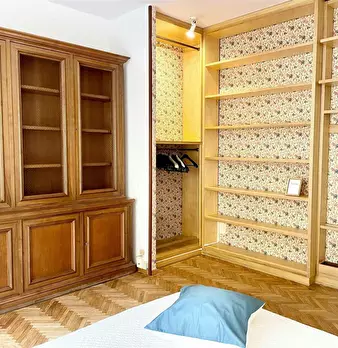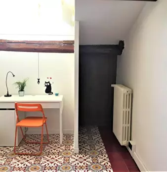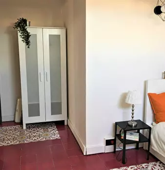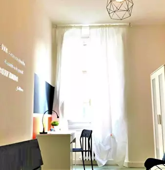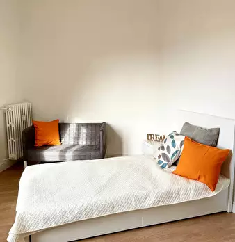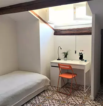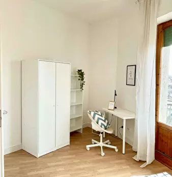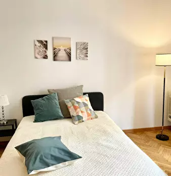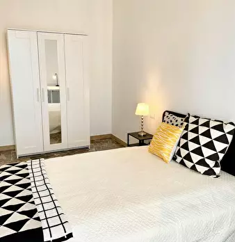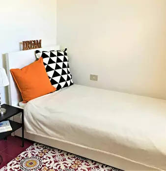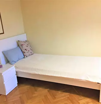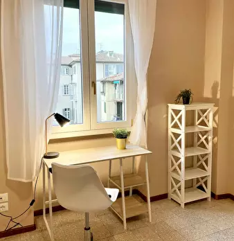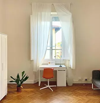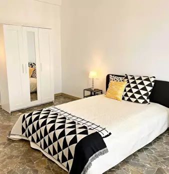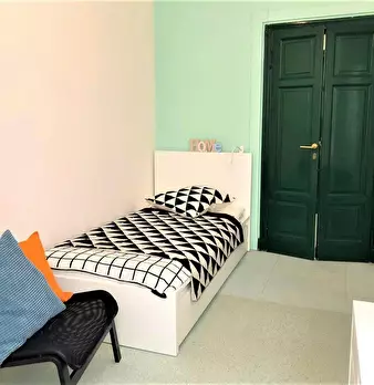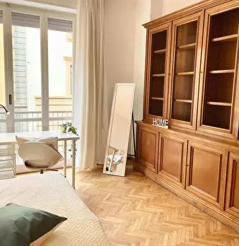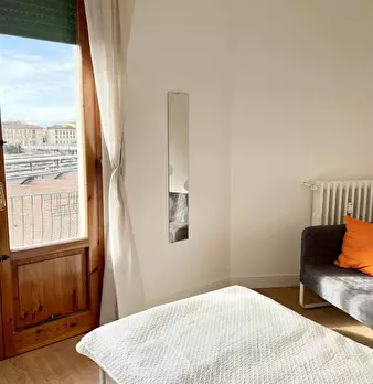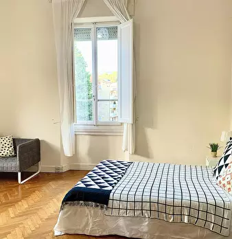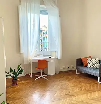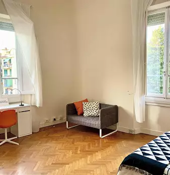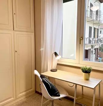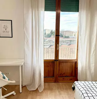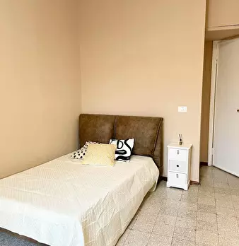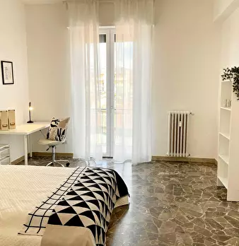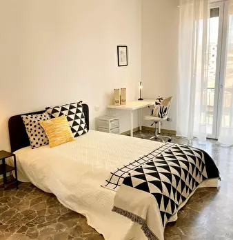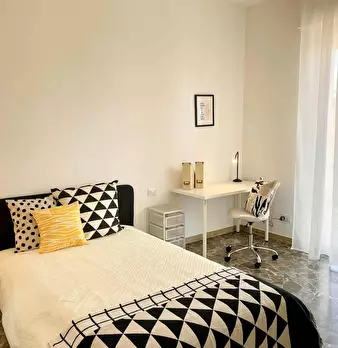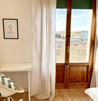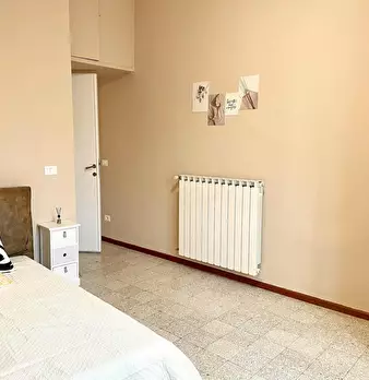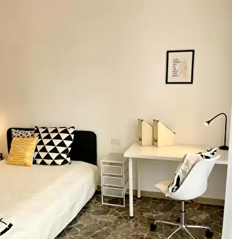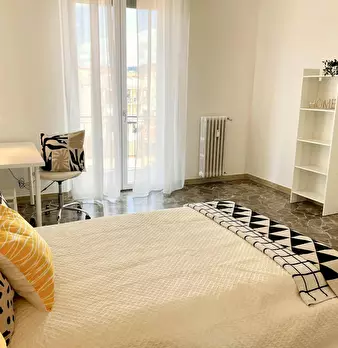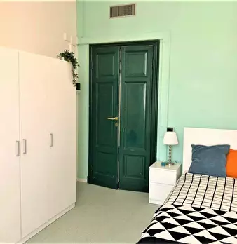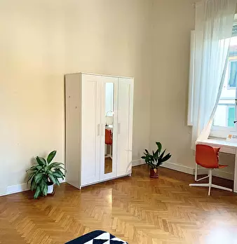 Camera molto ampia e luminosa, con due finestre, pavimento in parquet, letto (adesso una piazza e mezza), comodino, armadi, scrivania, libreria, attacco tv, Wi-Fi (connessione veloce Fibra) e aria condizionata/riscaldamento autonomo. L'appartament...