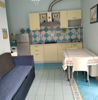 Sulla seconda fila del lungomare di San Benedetto del Tronto affitto al piano rialzato di una piccola palazzina, appartamentino arredato 4 posti letto: soggiorno con angolo cottura divano letto doppio camera matrimoniale e bagno con box doccia. Co...