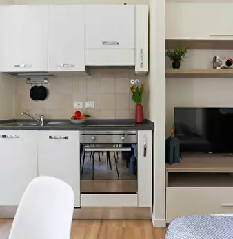 This small but very cozy studio will make you feel at home. It has all what you may need in only 16 meters! As soon as you enter, on the left side, there is the fully equipped kitchen, complete with microwave, cooker and sink. Next to it, there is...