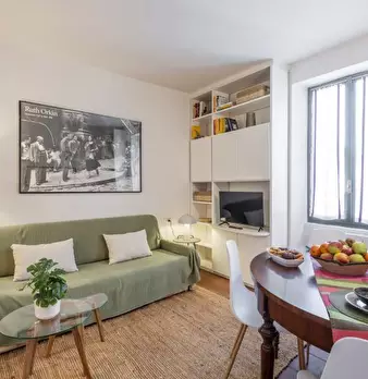 Questo appartamento arredato con una camera da letto a Tibaldi, Milano, offre un accogliente soggiorno con servizi essenziali come TV, forno e lavatrice in comune. L'appartamento è dotato di aria condizionata centralizzata per garantire un soggior...