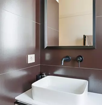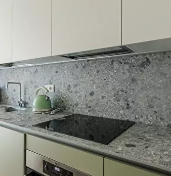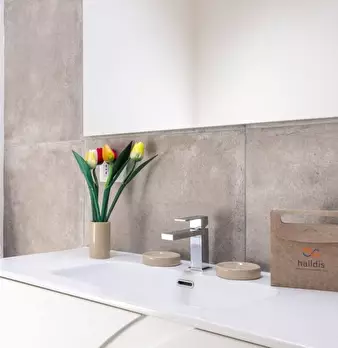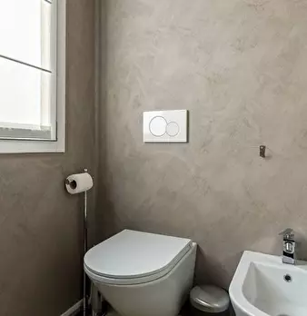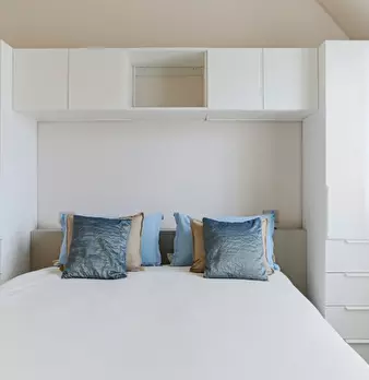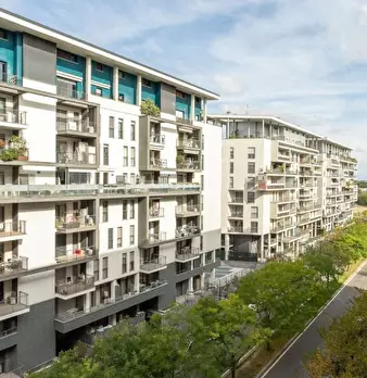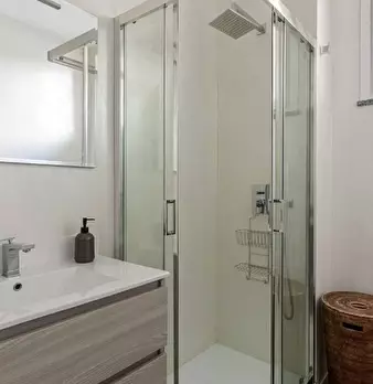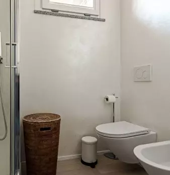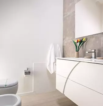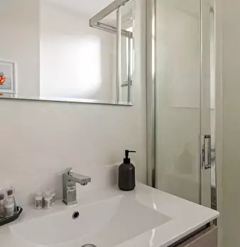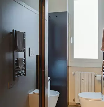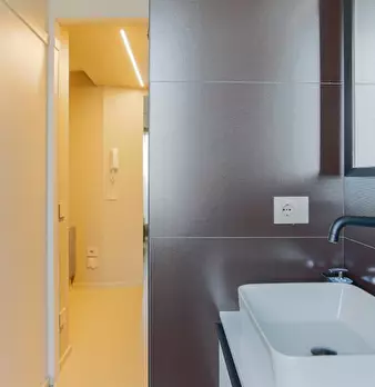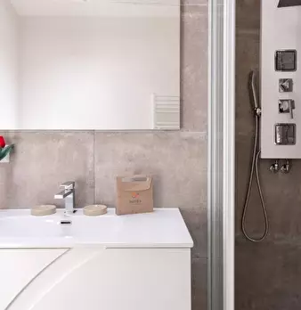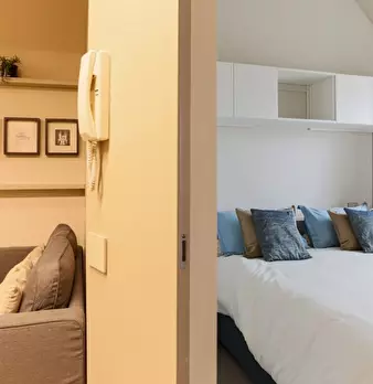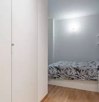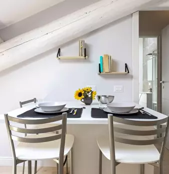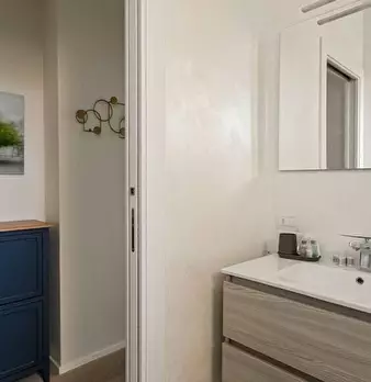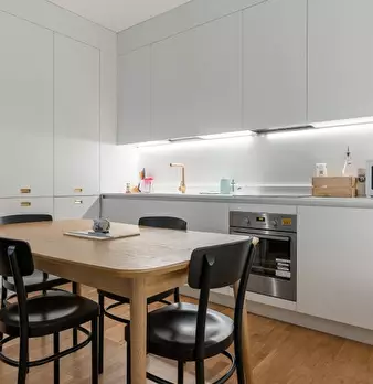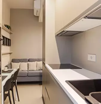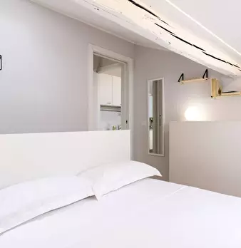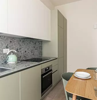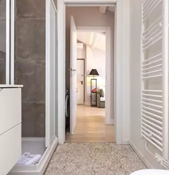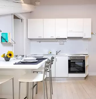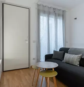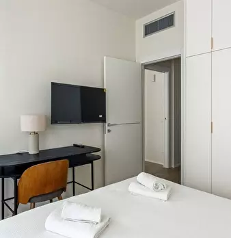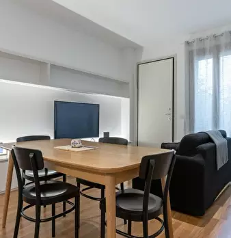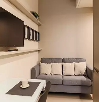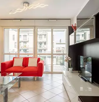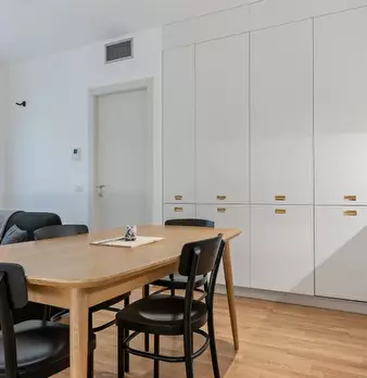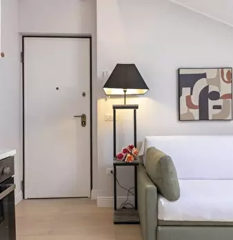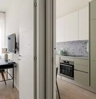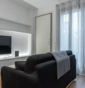 Questo moderno appartamento con una camera da letto si apre su un soggiorno luminoso e arioso con mobile TV, divano, tavolo da pranzo in legno e cucina a vista. La luce bianca, insieme alla porta finestra, illumina l'ambiente riscaldato dal pavi...