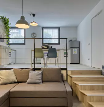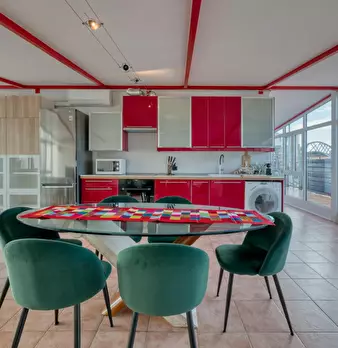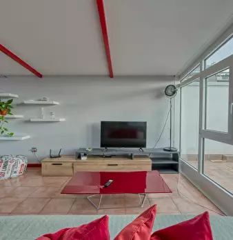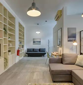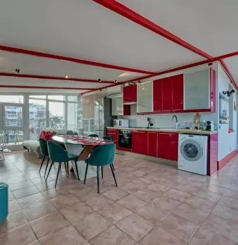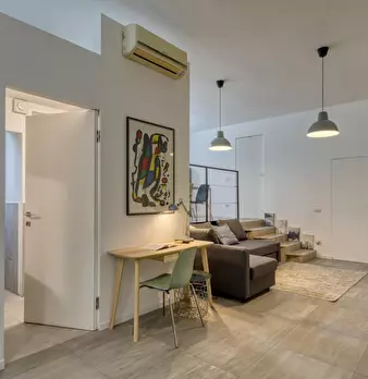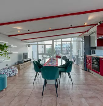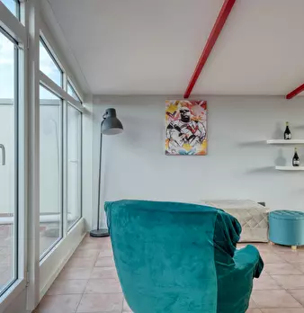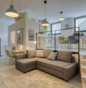 Loft-style apartment combining modern design and comfort, perfect for families, friends or business stays. The spacious living room with two double sofa beds and the fully equipped kitchen with dining area, connected by an internal staircase, cr...