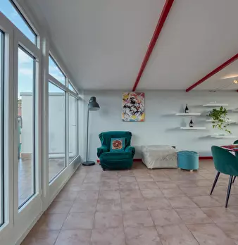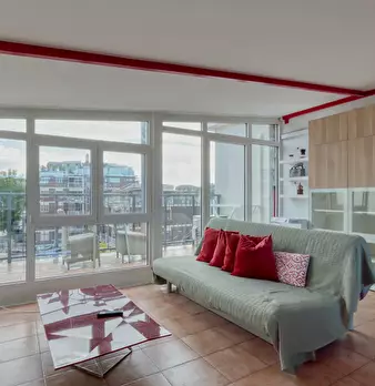 Top-floor, loft-style home flooded with light, featuring two city-view terraces. The large open space combines a living room with a double sofa bed, two single armchair beds, a fully equipped kitchen, and a dining area. Plus 1 queen bedroom and a ...