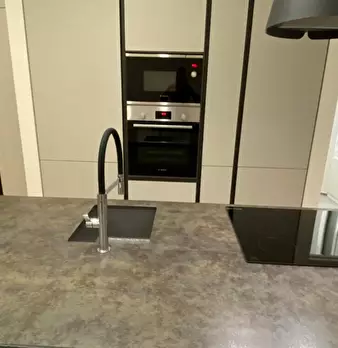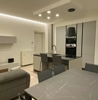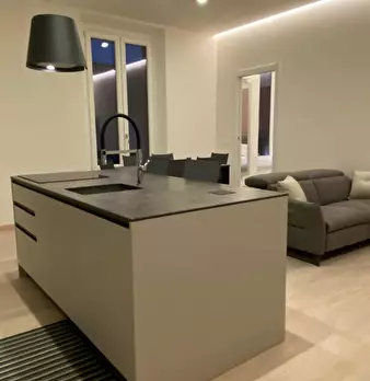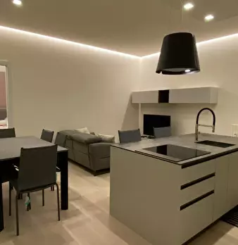 ---ENG--- The studio opens onto a modern living room dyed in sober shades of gray in which distinguish dining area and living area. The first consists of an open kitchen with oven and dishwasher, well lit by neon lights placed on the cabinets, an...