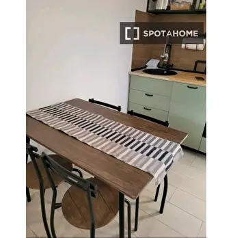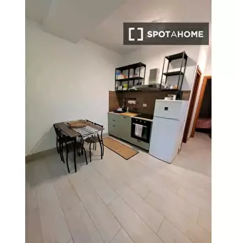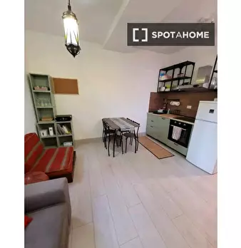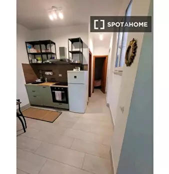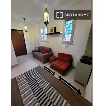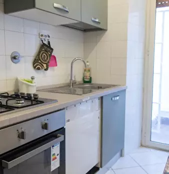 Questo appartamento di 59 m² con 1 camera da letto è disponibile in affitto a Portuense, Roma. C'è un accogliente soggiorno con divano e scrivania, e la cucina è completamente attrezzata con posate e stoviglie. Dispone inoltre di forno, piano cott...