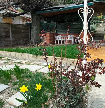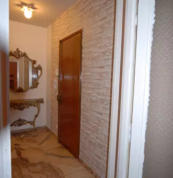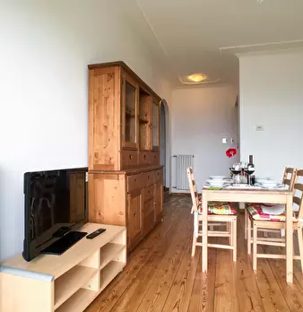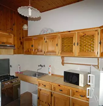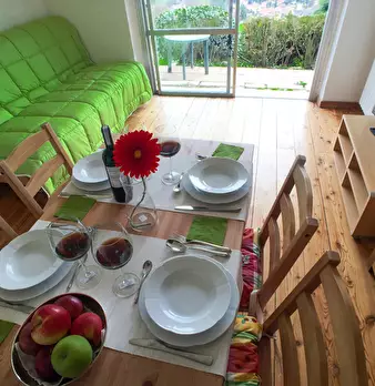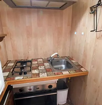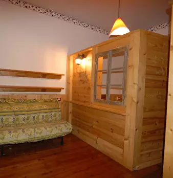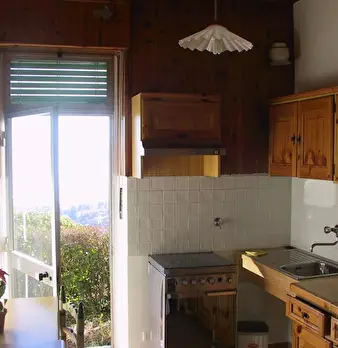 Appartamento bilocale, panoramico, con aiuola privata composto da: entrata, camera da letto matrimoniale, zona soggiorno divisa da una partizione in legno con divano letto matrimoniale, cucina abitabile, ampilio bagno con doccia e lavatrice, dehor...