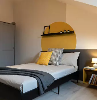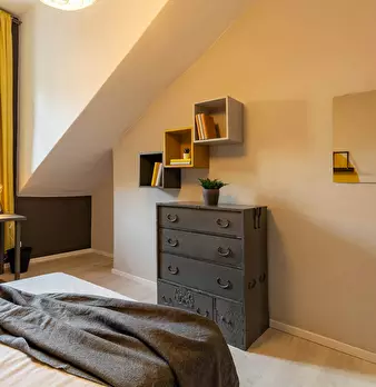 The room Large single room (18 sqm) pleasantly attic, furnished with: Double French bed, Bedside table, Wardrobe, Shoe cabinet, Desk, Chair, Bookcase, Armchair, Shelves and Mirror. The room is paved in light oak and has numerous light and current ...