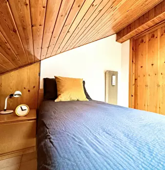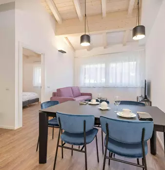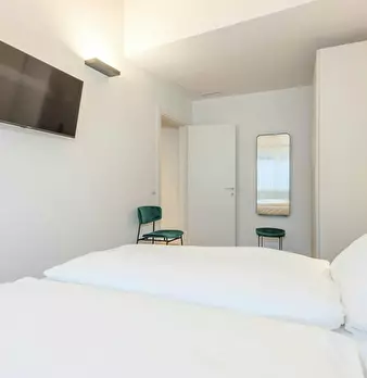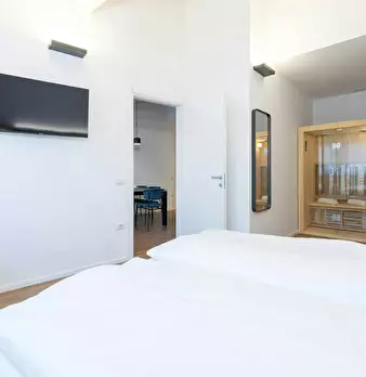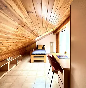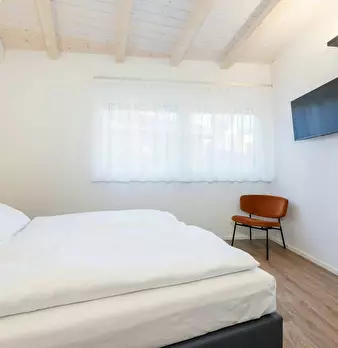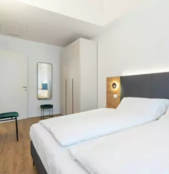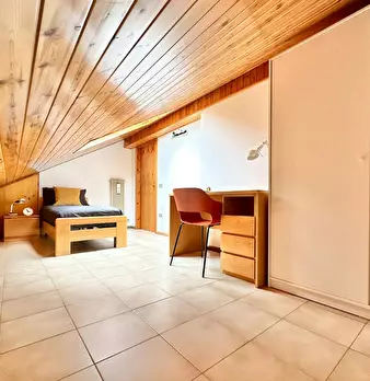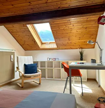 Luxury Student Apartment with Sauna Room: Elegant and bright double bedroom, furnished in a modern, linear style. The exposed-beam ceiling and wooden floors add warmth, while the large windows with sheer curtains provide a pleasant natural light....