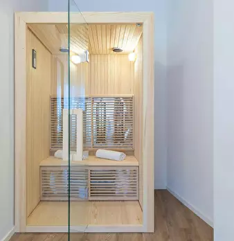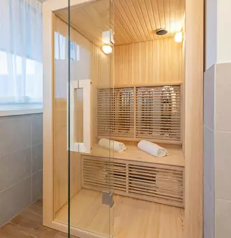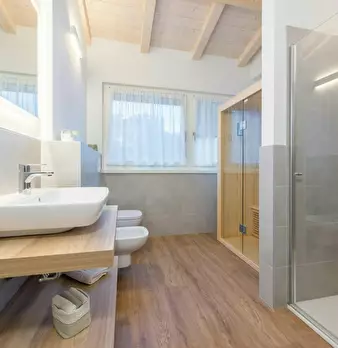Luxurious Room with Private Bathroom and Sauna! Room: Bright and modern double bedroom, tastefully furnished and equipped with every comfort. The exposed beam ceiling and large windows with sheer curtains create a welcoming and bright atmosphere....