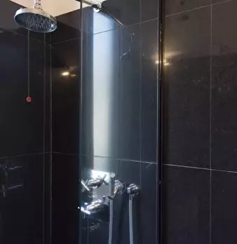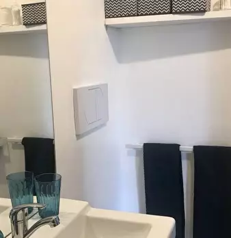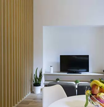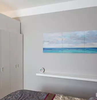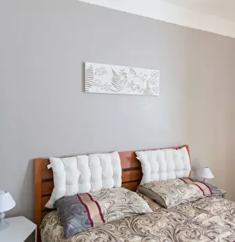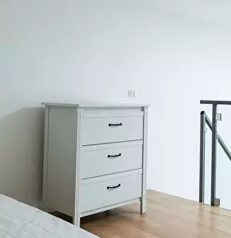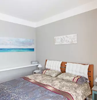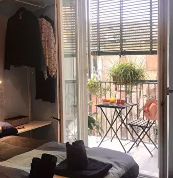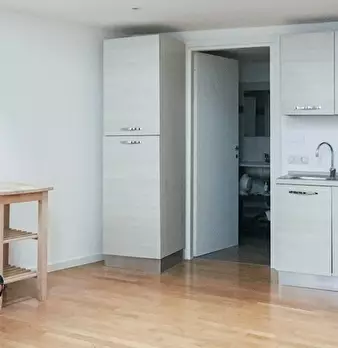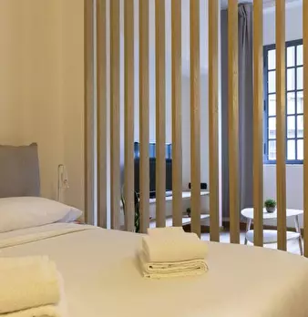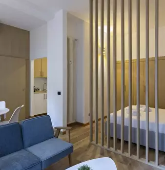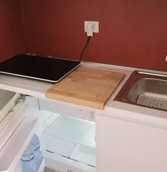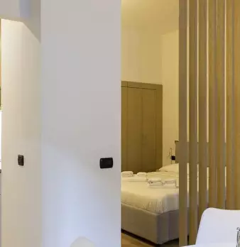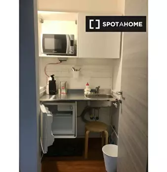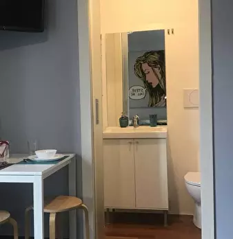 Questo appartamento monolocale dispone di un letto matrimoniale e di un letto singolo. Ci sono alcune scaffalature incorporate tra i due letti. La camera ha una finestra, TV, aria condizionata e riscaldamento. La cucina ha un piccolo tavolo e una ...