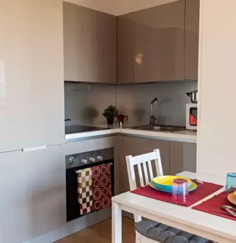 Questo monolocale con vista esterna, situato a Casal Bruciato, Roma, offre uno spazio abitativo accogliente e moderno. È completamente arredato e comprende una cucina attrezzata con elettrodomestici essenziali come lavastoviglie, forno e TV. L'imm...