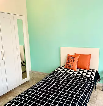Room: This private room features a single bed, a desk, and a closet, providing a comfortable and practical space for residents. Common Areas: Residents have access to shared spaces including: Living Room: Furnished with a sofa, a TV, and a dinin...