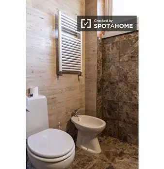 Questa camera esterna completamente arredata in un appartamento condiviso con 5 camere da letto a Portuense offre servizi come lavatrice privata, cucina attrezzata e balcone o terrazza. L'appartamento è verificato professionalmente da Spotahome e ...