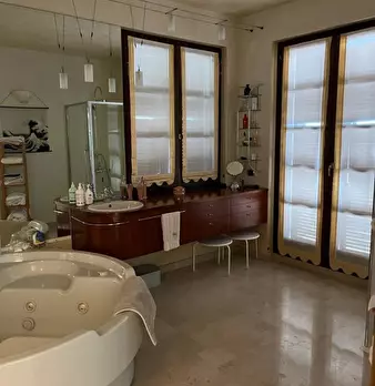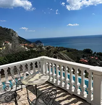 FINALE LIGURE In prima collina a picco sul mare, facilmente raggiungibile, proponiamo in affitto affascinante Villa Moderna, disposta su più piani, finemente arredata in ogni angolo e fornita di qualunque confort, dotata di suite con sauna e idrom...
