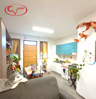 in bel fabbricato con ingresso semi indipendente da scale esterne composto da: soggiorno, cucina abitabile, camera matrimoniale con terrazzo, cameretta e bagno. L'immobile è accessoriata da ampio garage al piano seminterrato. Libero subito. Giudiz...