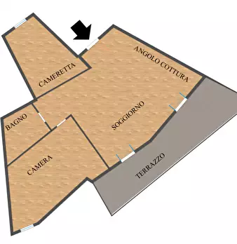 Appartamento posto al piano terra rialzato, composto da ingresso/soggiorno/pranzo con angolo cottura, camera da letto, bagno, terrazzo. Al piano S1 una cantina con bagno collegata internamente all'appartamento da una scala di legno.. Completa l'im...