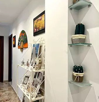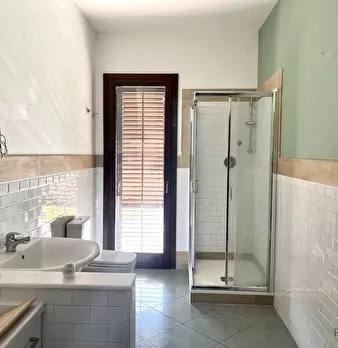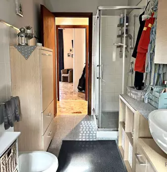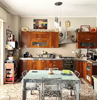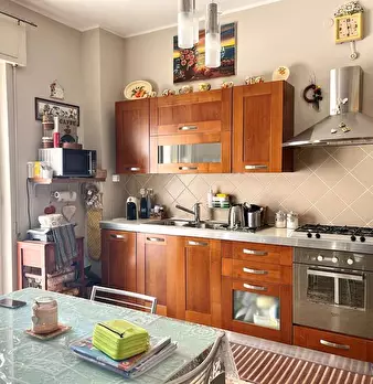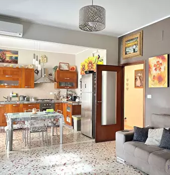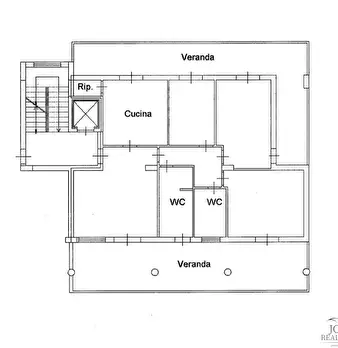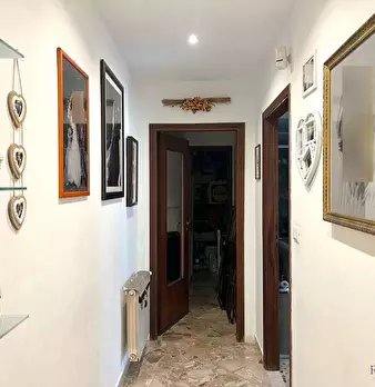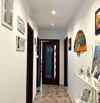 La casa ha un comodo ingresso, primo ripostiglio, salone doppio (con due porte finestra verso il grande balcone), lungo corridoio, cucina abitabile con accesso alla veranda chiusa con ripostiglio esterno (secondo ripostiglio), camera matrimoniale ...