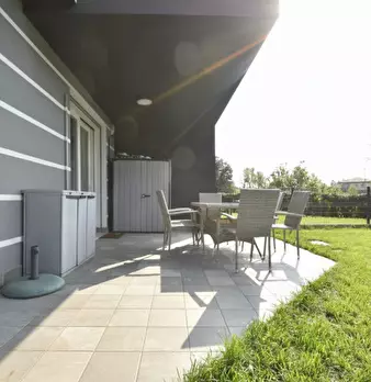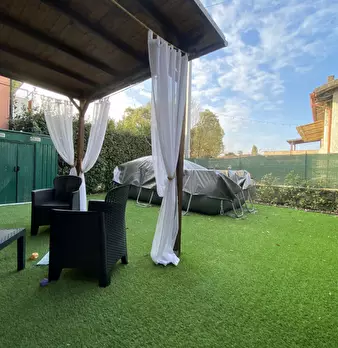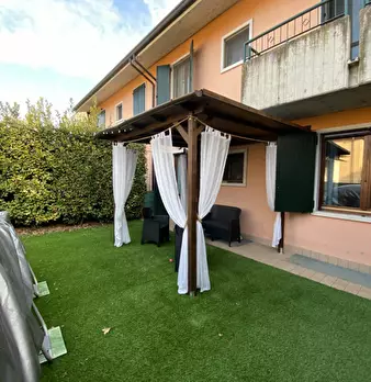 Castelnuovo del Garda: Appartamento al piano terra con giardino privato fronte e retro. L'abitazione è composta da spazioso soggiorno con cucina abitabile a vista di totali 36 mq, disimpegno della zona notte, Camera matrimoniale, Camera singola e ...