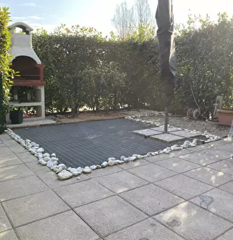 Castelnuovo del Garda: Erdgeschosswohnung mit privatem Vorder- und Hintergarten. Die Wohnung verfügt über ein geräumiges Wohnzimmer mit offener Küche (36 m²), einen Flur zum Schlafbereich, ein Schlafzimmer mit Doppelbett, ein Schlafzimmer mit Einz...