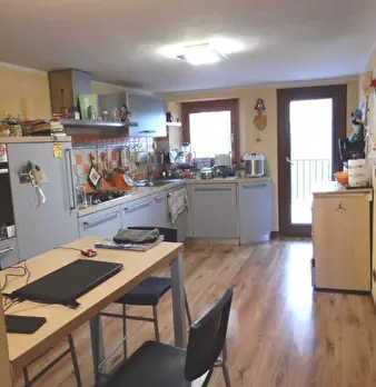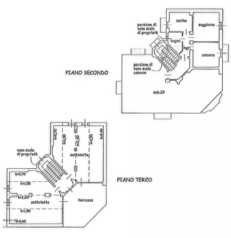 Appartamento al piano secondo di ingresso, bagno, cucina abitabile, soggiorno, una camera da letto e due balconi con ampio doppio locale sottotetto al piano terzo e adiacente al fabbricato condominiale, area libera recintata con piccolo fabbricato...