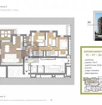 Brescia a due passi dal centro, disponibile quadrilocale al settimo piano con doppia esposizione Nord / Ovest. Tipologia B3. Entrando dalla porta d'ingresso troviamo un soggiorno con una bella terrazza ad angolo, cucina a vista, una camera matrimo...