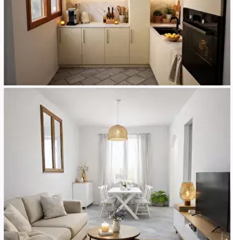 Porzione di casa con ingresso indipendente, tutto al piano terra, con stanze grandi e finestre ampie. Cucina, cucinotto, sala, due camere matrimoniali, una cameretta, un bagno, un garage comunicante di 16 mq. Nella corte in comune un capannone di ...