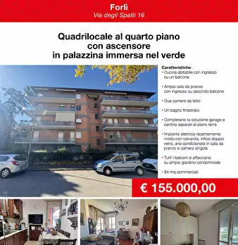 In Vendita quadrilocale al quarto piano a Forlì in Via Degli Spalti 16 a pochi passi dal centro in condominio tenuto in ottimo stato con ascensore. L'appartamento si compone di:- Cucina abitabile con ingresso su un primo balcone - Ampia sala da pr...