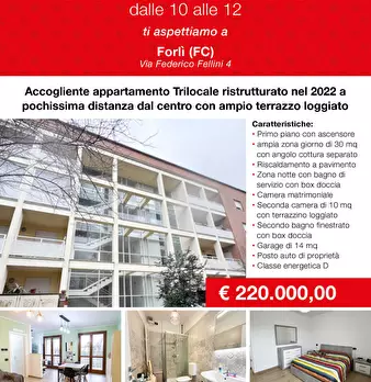 IN VENDITAA Forli, nel quartiere Foro Boario a pochissima distanza dal centro storico, proponiamo in vendita Open House questo accogliente appartamento trilocale di 70mq calpestabilisituato al primo piano con ascensore in una recente palazzina del...
